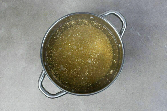 In einem mittelgroßen Topf 650ml leicht gesalzenes Wasser zum Kochen bringen. Die Quinoa in einem feinmaschigen Sieb mit warmem Wasser abspülen, in das kochende Wasser geben und 10–12Min. abgedeckt bei niedriger bis mittlerer Hitze sanft köcheln lassen. Vom Herd nehmen und bis zum Servieren warm halten.