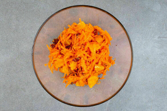 Die Karotten ggf. schälen und grob raspeln. Die Orangen komplett schälen und in ca. 1cm große Würfel schneiden, austretenden Saft auffangen. Die Chilischoten halbieren, entkernen und in feine Streifen schneiden. Die Karotten mit den Orangen samt Saft, den Datteln, 3EL hellem Essig und 2EL Olivenöl vermengen. Mit Chili nach Geschmack sowie Salz und Pfeffer würzen.