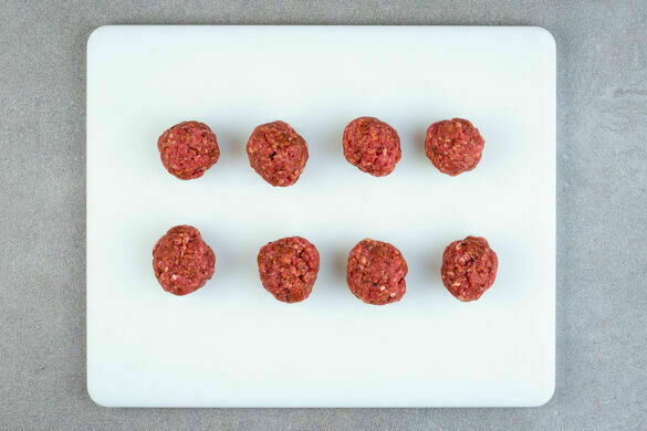 Das Hackfleisch gründlich mit 4TL Gewürzmischung sowie je 1 Prise Salz und Pfeffer verkneten und zu 16 Bällchen formen. Tipp: Für extra saftige Fleischbällchen das Hackfleisch mit 2–4TL Wasser oder Sahne vermengen.