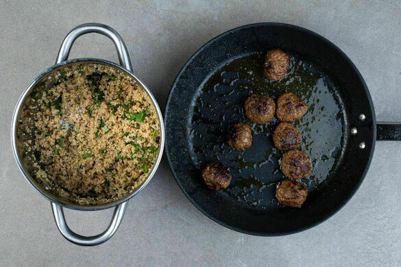 Die Fleischbällchen in einer großen Pfanne mit 1EL Olivenöl bei mittlerer Hitze 4–6Min. rundum appetitlich braun braten. Die Quinoa mit der 1/2 der Kräuter vermengen und mit Salz und Pfeffer abschmecken. Die Fleischbällchen mit der Quinoa, dem Salat und dem Gurkenjoghurt anrichten und mit den restlichen Kräutern garniert servieren.