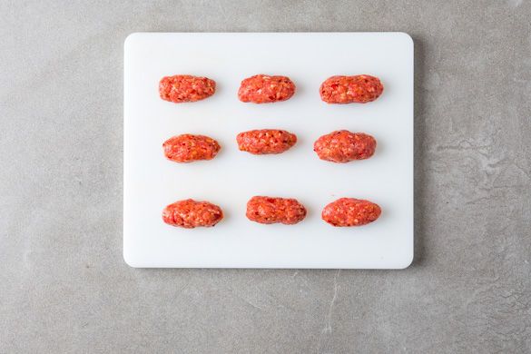Nun das Hackfleisch je nach Schärfewunsch mit der gewünschten Menge Sambal Oelek verkneten und mit Salz abschmecken. Mit den Händen ca. 12-14 kleine Hackfleischröllchen formen.