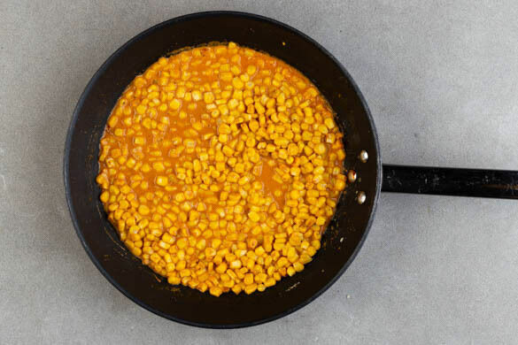Den Mais in ein Sieb abgießen und abtropfen lassen. In einer großen Pfanne ohne Zugabe von Fett bei starker Hitze 3–4Min. anbraten, bis der Mais Röstspuren aufweist, dann herausnehmen. 3EL Butter in derselben Pfanne bei mittlerer Hitze schmelzen lassen. Die ½ der Chilipaste einrühren und langsam 200ml Milch angießen. Den Mais untermengen und die Pfanne vom Herd nehmen.