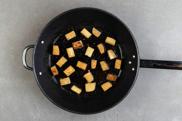 Den Tofu trocken tupfen und in 1–2cm große Würfel schneiden. In einer zweiten mittelgroßen Pfanne mit 2EL Pflanzenöl, ½TL Salz und 1 Prise Pfeffer bei mittlerer bis starker Hitze 4–6Min. scharf anbraten. Auf etwas Küchenpapier abtropfen lassen und die Pfanne auswischen.