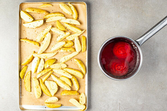 Den Backofen auf 220°C (200°C Umluft) vorheizen. Die Rote Bete schälen, in dünne Scheiben schneiden, in einem kleinen Topf mit ausreichend Wasser aufkochen und bei starker Hitze abgedeckt ca. 15Min. garen. Die Kartoffeln in ca. 1cm breite Spalten schneiden, mit 2EL Olivenöl, der 1/2 des Grillgewürzes, 1TL Salz und 1 kräftigen Prise Pfeffer vermengen und 20–25Min. im Ofen backen.