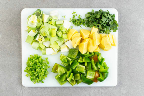 Den Lauch längs halbieren und quer in 2–3cm große Stücke schneiden. Die Paprika jeweils vierteln und entkernen, dann 9 Paprikaviertel in grobe Stücke, die übrige Paprika in kleine Würfel schneiden. Die Korianderblätter grob, die -stängel separat fein schneiden. Die ½ der Kartoffeln schälen und in 2–3cm große Stücke schneiden.