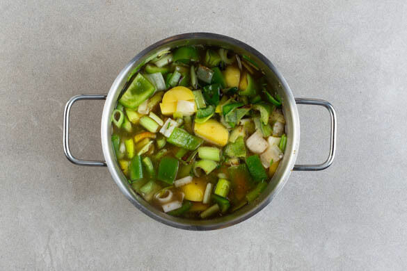 Den Lauch, die groben Paprikastücke und die geschälten Kartoffeln in einem großen Topf mit 2EL Olivenöl bei mittlerer Hitze ca. 3Min. anbraten. Die Gewürzmischung und die Korianderstängel hinzugeben und ca. 2Min. mitbraten. 800ml Wasser angießen, dann die ½ des Brühgewürzes einrühren. Das Gemüse abgedeckt in 13–15Min. weich köcheln.