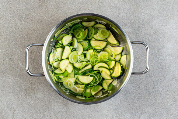 Den Lauch in dünne Ringe schneiden. Die Zucchini längs halbieren, dann in dünne Scheiben schneiden. Den Knoblauch schälen und grob würfeln. Den Lauch, die Zucchini und den Knoblauch in einem mittelgroßen Topf mit 1EL Pflanzenöl und 1 Prise Salz bei mittlerer Hitze ca. 2Min. anbraten, dabei regelmäßig umrühren.