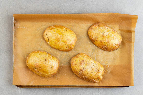 Den Backofen auf 220°C (200°C Umluft) vorheizen. Die Kartoffeln samt Schale längs halbieren und mit einer Gabel einige Male einstechen. Auf einem mit Backpapier ausgelegten Backblech mit 1EL Olivenöl und 1 kräftigen Prise Salz einreiben und mit der Schnittseite nach unten im Ofen ca. 25Min. backen.