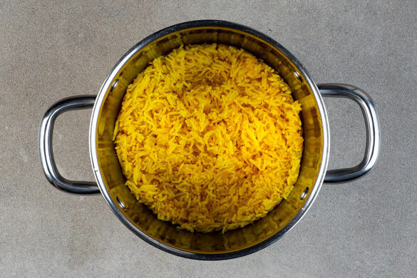 In einem kleinen Topf 100ml Kokosmilch mit 200ml Wasser aufkochen. Den Reis in einem Sieb kalt abspülen, bis das Wasser klar bleibt. Sobald das Wasser kocht, den Reis mit der ½ des Currypulvers und 1 kräftigen Prise Salz hineingeben und abgedeckt bei niedrigster Hitze 10–12Min. kochen, bis das Wasser aufgesogen und der Reis gar ist. Ca. 5Min. ohne Hitzezufuhr ziehen lassen.