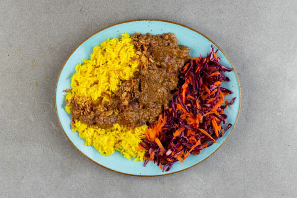 Den Reis auf Teller verteilen und das Curry darauf anrichten. Mit den Röstzwiebeln garnieren und mit dem Rotkohlsalat servieren.