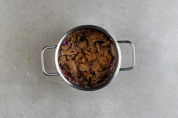 Die Zwiebeln schälen, halbieren und fein würfeln. 1EL Pflanzenöl in einem großen Topf erhitzen. Das vegane Rindergulasch ohne Sauce in den Topf geben, die Zwiebelwürfel hinzufügen und bei mittlerer Hitze ca. 3Min. anbraten. Die Gewürzmischung einrühren und ca. 1Min. mitbraten.