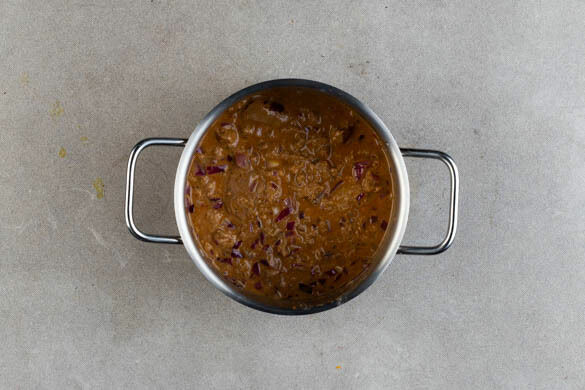 Die restliche Kokosmilch und die Rindergulasch-Sauce mit 100ml Wasser in den Topf gießen und unter Rühren aufkochen. Bei mittlerer Hitze 5–7Min. köcheln lassen und ggf. löffelweise Wasser zugeben, falls die Sauce zu dickflüssig ist.
