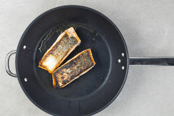 Den Fisch in einer großen Pfanne mit 2EL Olivenöl bei mittlerer Hitze auf der Hautseite 2–3Min. kross anbraten. Dann wenden und weitere 3–4Min. braten. Die Pfanne vom Herd nehmen und den Fisch 1–2Min. ruhen lassen. Die Lauchzwiebeln unter das Linsengemüse mischen, mit Salz, Pfeffer und 1–2TL Essig abschmecken und mit dem Fisch und dem Salat servieren.