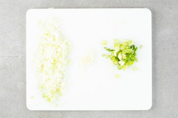 Die Zwiebel schälen, halbieren und fein würfeln. Den Knoblauch schälen und ebenfalls fein würfeln. Die Lauchzwiebel in feine Ringe schneiden.