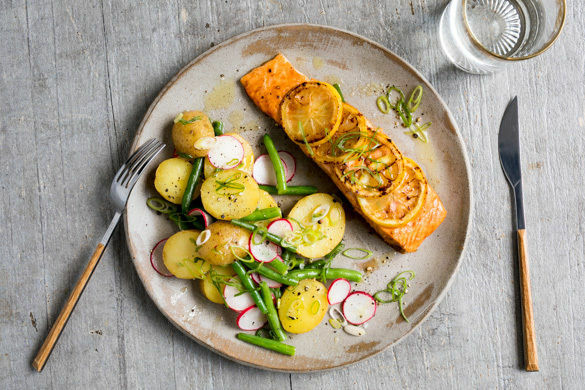Das erfrischende Aroma der Zitrone ist in diesem schnell zubereiteten Gaumenschmaus ein echter Star. Die Zitronenscheiben werden nämlich unter den saftigen Lachsfilets in der Pfanne gebraten, wodurch sie leicht karamellisieren und dem Gericht einen ganz besonderen Geschmack verleihen. Dazu gibt es einen feinen Kartoffelsalat mit grünen Bohnen und Radieschen.