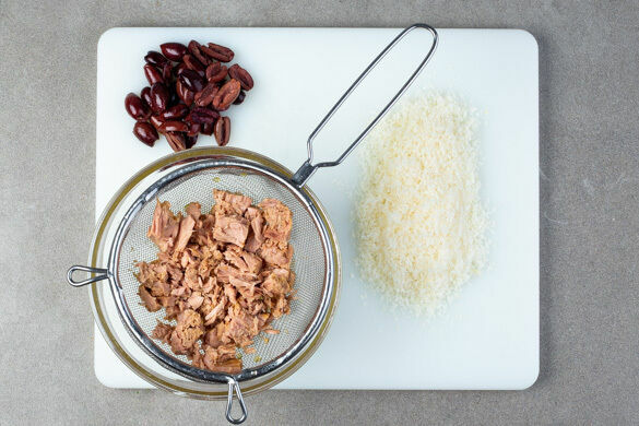 Die Oliven in einem Sieb abtropfen lassen, dann halbieren. Den Thunfisch abgießen und abtropfen lassen. Den Käse fein reiben.