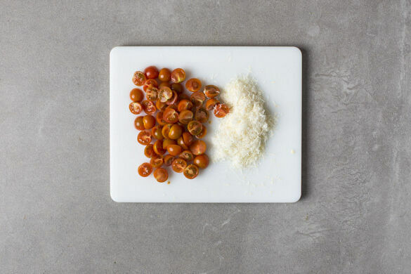 Die Kirschtomaten halbieren. Den Käse fein reiben.