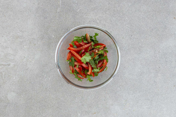 Die Paprika, die Zwiebeln und den Knoblauch in einer mittelgroßen Pfanne mit 1EL Olivenöl, 1TL Gewürzmischung und 1 Prise Salz bei mittlerer Hitze 2–3Min. anbraten, bis die Zwiebeln weich sind.