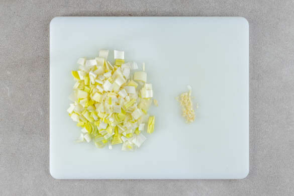 Den Backofen auf 220°C (200°C Umluft) vorheizen. Den Lauch längs vierteln, dann in feine Würfel schneiden. Den Knoblauch schälen und ebenfalls fein würfeln.