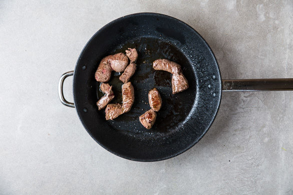 Inzwischen das Fleisch in ca. 3-4cm große Stücke schneiden und in einer großen Pfanne mit 1-2El Olivenöl auf beiden Seiten je ca. 1-2Min. scharf anbraten, mit Salz und Pfeffer würzen.