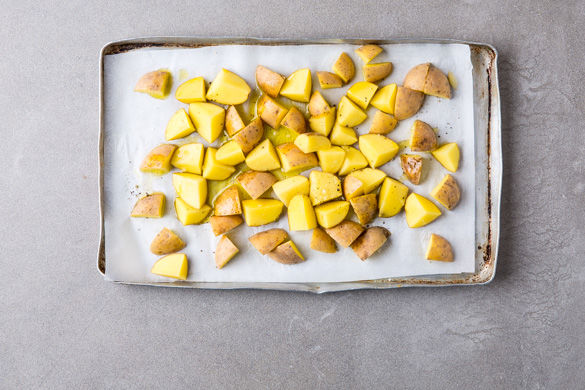 Den Grillofen auf 220°C vorheizen. Die Kartoffeln in ca. 2-3cm große Stücke schneiden, mit 2EL Olivenöl, Salz und Pfeffer vermengen und auf einem mit Backpapier ausgelegten Backblech ca. 10-15Min. im oberen Drittel des Ofens grillen.