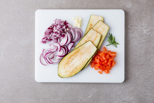 Inzwischen die Zwiebeln schälen, eine Zwiebel in feine Würfel, die zweite Zwiebel in grobe Streifen schneiden. Den Knoblauch schälen und in fein hacken. Die Auberginen längs in dünne Scheiben schneiden und mit etwas Salz bestreuen, ca. 5Min. ziehen lassen, dann abtupfen. Den Rosmarin vom Stängel streifen. Die Tomaten vierteln, entkernen und fein würfeln.