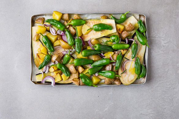 Nun die vorgegrillten Kartoffeln mit den Zwiebelstreifen, Auberginen, Piementos, dem Rosmarin, 2-3EL Olivenöl, Salz und Pfeffer mischen und gleichmäßig auf dem Backblech verteilen. Weitere 15-20Min. auf der zweiten Schiene von oben grillen.
