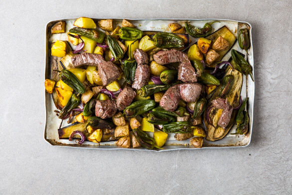 Dann das Fleisch für die letzten ca. 5-6Min. mit zum Gemüse auf das Backblech geben. Tipp: Die Backzeit variiert je nach Dicke des Fleisches und dem gewünschten Gargrad.