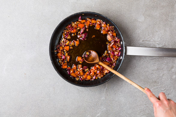 Inzwischen die Zwiebelwürfel mit dem Knoblauch in 1-2EL Olivenöl in einer kleinen Pfanne ca. 1-2Min. anschwitzen. Zuerst den Ketchup, dann die Tomatenwürfel unterrühren. Mit Salz und Pfeffer abschmecken und auf niedriger Hitze sanft köcheln lassen, bis das Ofengemüse fertig ist.