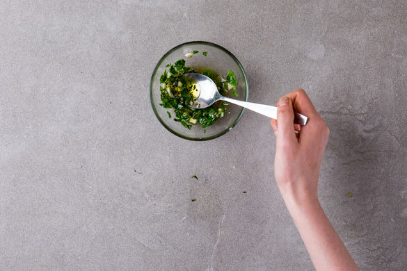 Die Thymianblättchen abzupfen und mit der Petersilie samt Stängeln fein hacken. Den Knoblauch schälen und fein hacken. Die Kräuter und den Knoblauch mit 2-3EL Olivenöl verrühren.