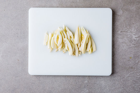 Den Fenchel längs halbieren, vom Strunk befreien und in feine Streifen schneiden. Etwas Salz und Zucker darüberstreuen und die Fenchelstreifen kräftig durchkneten, dann ca. 10-12Min. ziehen lassen. Mit Olivenöl und Essig abschmecken.