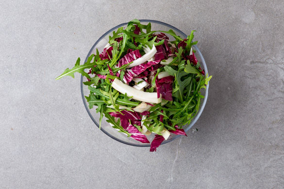 Den Rucola nach Wunsch grob hacken. Den Radicchio vom Strunk befreien, vierteln und in dünne Streifen schneiden. Dann Rucola und Radicchio mit dem Fenchelsalat mischen.