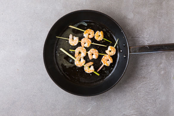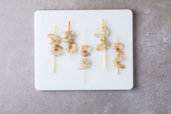 Die Garnelen mit Salz und Pfeffer würzen und in dem Kräuteröl marinieren. Die Enden der Zitronengrassstangen mit einem Messer leicht schräg anschneiden und die Garnelen aufspießen. Bis zur weiteren Verwendung wieder in die Marinade legen.