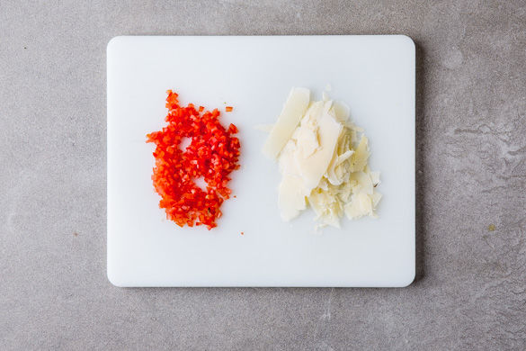 Die Tomate halbieren, entkernen und in kleine Würfel schneiden. Den Käse mit einem Sparschäler in feine Scheiben hobeln.