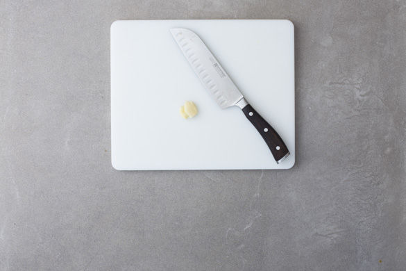 Den Knoblauch schälen und mit der breiten Seite eines Messer flach drücken.