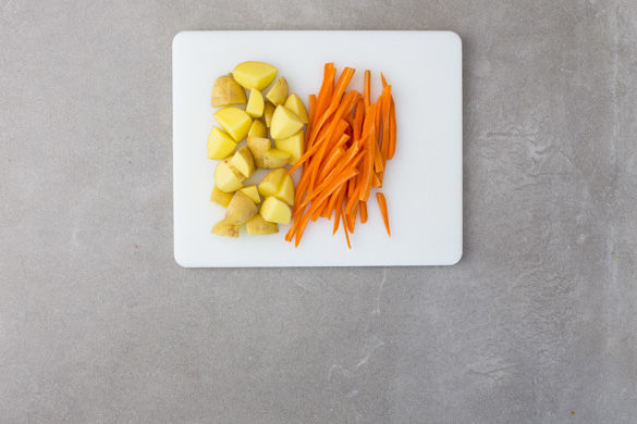 Den Ofen auf 190°C Umluft oder 210°C Ober-/Unterhitze vorheizen. Die Kartoffeln in Spalten schneiden. Die Karotten schälen und längs halbieren, dann in ca. 1/2cm Stifte schneiden.