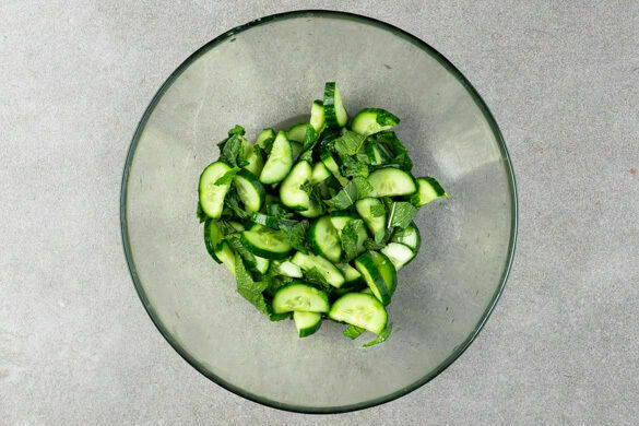 Die Gurke längs halbieren und in dünne Scheiben schneiden. Die Minzeblätter von den Stängeln zupfen und grob schneiden. 3EL hellen Essig, 1EL Zucker und 1 kräftige Prise Salz verrühren, bis Zucker und Salz sich aufgelöst haben, dann mit den Gurken und der Minze vermengen und beiseitestellen.