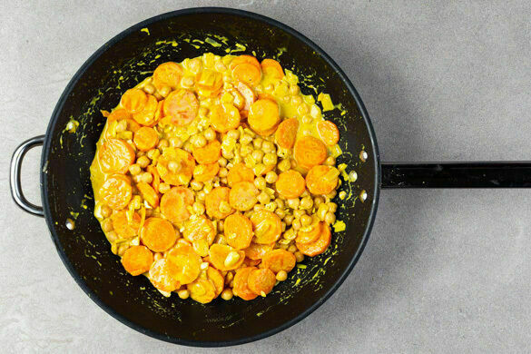 Die Karotten ggf. schälen, in dünne Scheiben schneiden und in einer großen Pfanne mit 3EL Pflanzenöl bei mittlerer bis starker Hitze ca. 2Min. anbraten. Die Zwiebel schälen, halbieren und grob würfeln. Den Knoblauch schälen und ebenfalls grob würfeln. Die Zwiebeln und den Knoblauch zu den Karotten geben, mit 1 Prise Salz würzen und ca. 3Min. mitbraten.