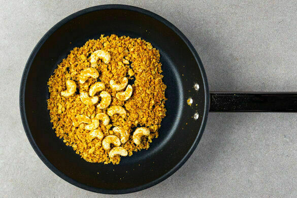 Das Panko-Paniermehl, das restliche Currypulver und die übrigen Cashews mit 2EL Pflanzenöl und 1 kräftigen Prise Salz in einer kleinen Pfanne bei mittlerer Hitze 3–5Min. knusprig anrösten, dabei gut umrühren. Die Gurken abgießen. Den Reis und das Curry auf tiefe Teller verteilen, die Gurken darauf anrichten und mit dem Panko-Cashew-Crunch garniert servieren.