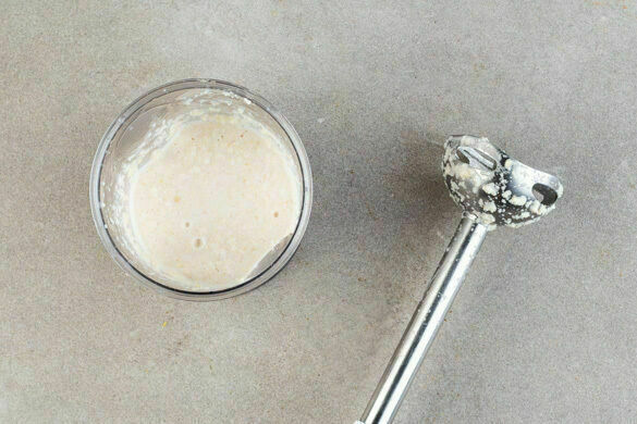 Die Mandelblättchen mit 1EL Zucker, 100ml Wasser und 1 kräftigen Prise Salz in einem hohen Gefäß mit einem Stabmixer fein pürieren.