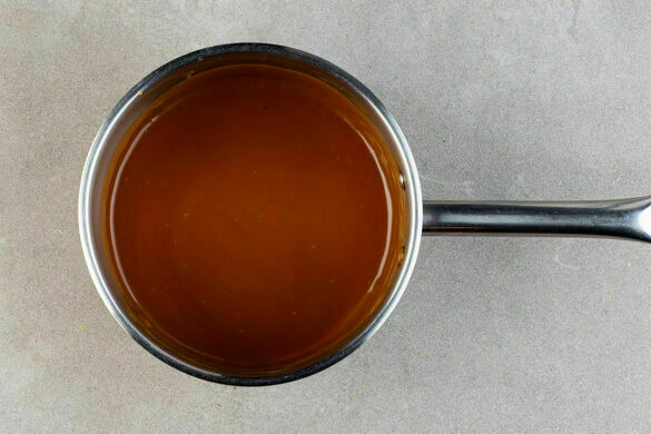 Einen mittelgroßen Topf mittel bis stark erhitzen. Den restlichen Zucker und 80ml Wasser in den Topf geben und ohne Rühren aufkochen lassen, den Topf ggf. leicht hin und her schwenken. Vorsicht, der Zucker wird sehr heiß! Sobald sich der Zucker aufgelöst hat und anfängt, goldbraun zu werden, sofort den Topf vom Herd nehmen.
