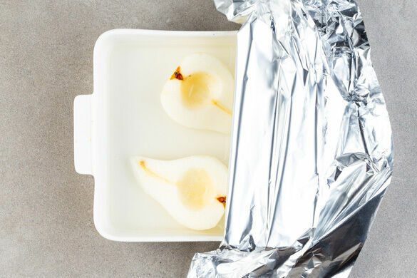 Den Ofen auf 240°C (220°C Umluft) vorheizen. Die Zitronenschale abreiben und eine Zitronenhälfte auspressen. Die Birne schälen, halbieren und entkernen. Die Birnenhälften in eine Auflaufform legen und ca. 2cm hoch Wasser angießen. Mit dem Vanillezucker bestreuen und mit 1EL Zitronensaft beträufeln. Mit Alufolie abdecken und im Ofen in 20–25Min. weich garen.