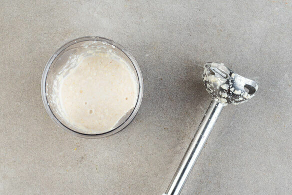 Die Mandelblättchen mit 1½TL Zucker, 50ml Wasser und 1 Prise Salz in einem hohen Gefäß mit einem Stabmixer fein pürieren.