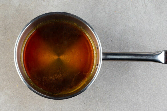 Einen kleinen Topf mittel bis stark erhitzen. Die ½ des restlichen Zuckers und 40ml Wasser in den Topf geben und ohne Rühren aufkochen lassen, den Topf ggf. leicht hin und her schwenken. Vorsicht, der Zucker wird sehr heiß! Sobald sich der Zucker aufgelöst hat und anfängt, goldbraun zu werden, sofort den Topf vom Herd nehmen.