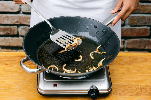Den Boden einer großen Pfanne mit Pflanzenöl bedecken und das Öl stark erhitzen. Einen Zwiebelstreifen ins Öl geben; wenn das Öl aufschäumt und Blasen wirft, ist es heiß genug. Die Zwiebelstreifen portionsweise bei starker Hitze ca. 3Min. goldbraun braten, aus der Pfanne nehmen und auf Küchenkrepp abtropfen lassen. Den Schnittlauch in kleine Röllchen schneiden.