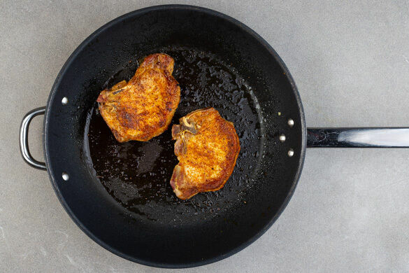 Das Fleisch trocken tupfen, mit der ½ der Gewürzmischung, ½TL Salz und 1 Prise Pfeffer einreiben, dann in einer mittelgroßen Pfanne mit 1EL Olivenöl bei mittlerer bis starker Hitze jeweils 2–3Min. auf jeder Seite goldbraun anbraten. Auf einem Teller beiseitestellen.