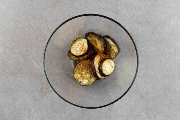 Die Aubergine auf einem mit Backpapier ausgelegten Backblech mit 1EL Olivenöl und 1 kräftigen Prise Salz einreiben und im Ofen ca. 10Min. rösten. Anschließend die Auberginenscheiben von dem Backblech nehmen und mit der Gewürzmischung vermengen.