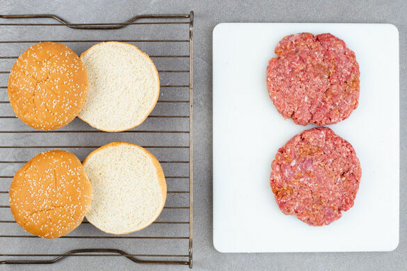 Das Hackfleisch gründlich mit der Gewürzmischung und 1 Prise Salz verkneten und zu 2 Pattys formen, die etwa den Durchmesser der Burgerbrötchen haben. Die Brötchen halbieren und auf einem Backrost im Ofen 3–4Min. aufbacken.