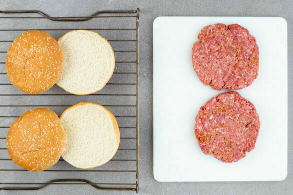 Das Hackfleisch gründlich mit der Gewürzmischung und 1 kräftigen Prise Salz verkneten und zu 4 Pattys formen, die etwa den Durchmesser der Burgerbrötchen haben. Die Brötchen halbieren und auf einem Backrost im Ofen 3–4Min. aufbacken.