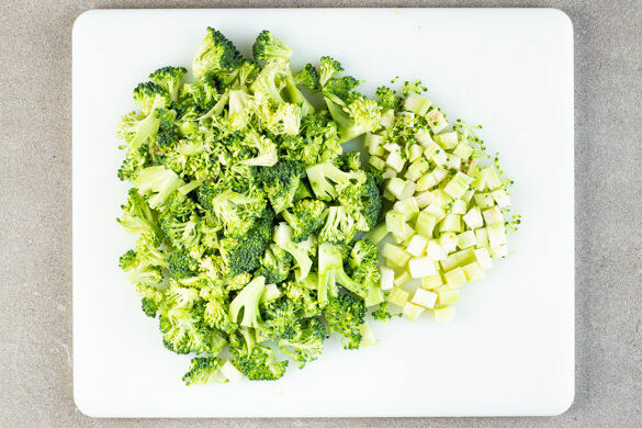 In einem großen Topf 800ml leicht gesalzenes Wasser zum Kochen bringen. Den Brokkoli in mundgerechte Röschen schneiden. Die unteren 1–2cm des Strunks jeweils abschneiden, ggf. vorhandene Blätter entfernen. Den Strunk von holzigen Stellen befreien oder ggf. vollständig schälen, dann in ca. 0,5cm große Würfel schneiden.